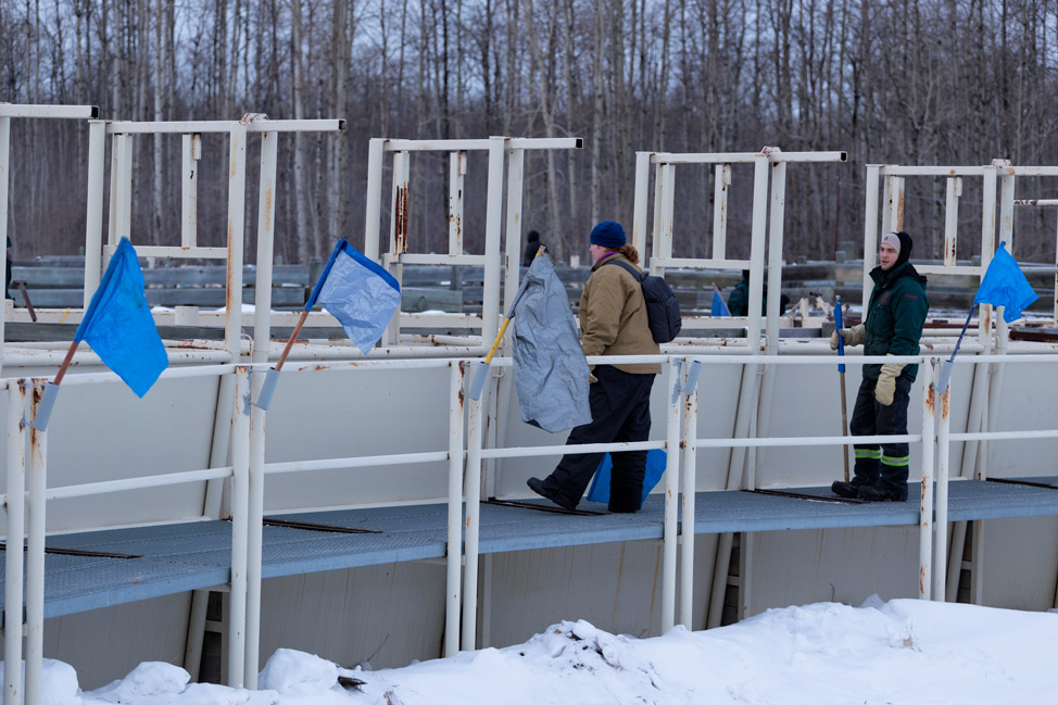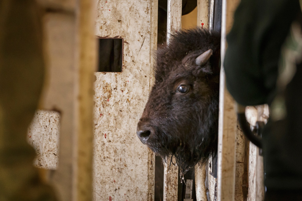 From one section to another they moved, until they were finally trapped in a slim enclosure, waiting for their turn. Some panicked, one even got flipped over, and staff raced to right the young calf. Others had blue flags lowered into their line of vision, the sight of that colour proven to calm the bison. They were soon shepherded through and back to roam again. And without understanding, of course, of the importance of their journey.