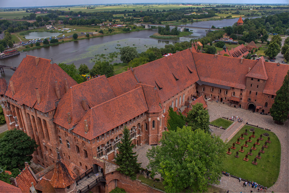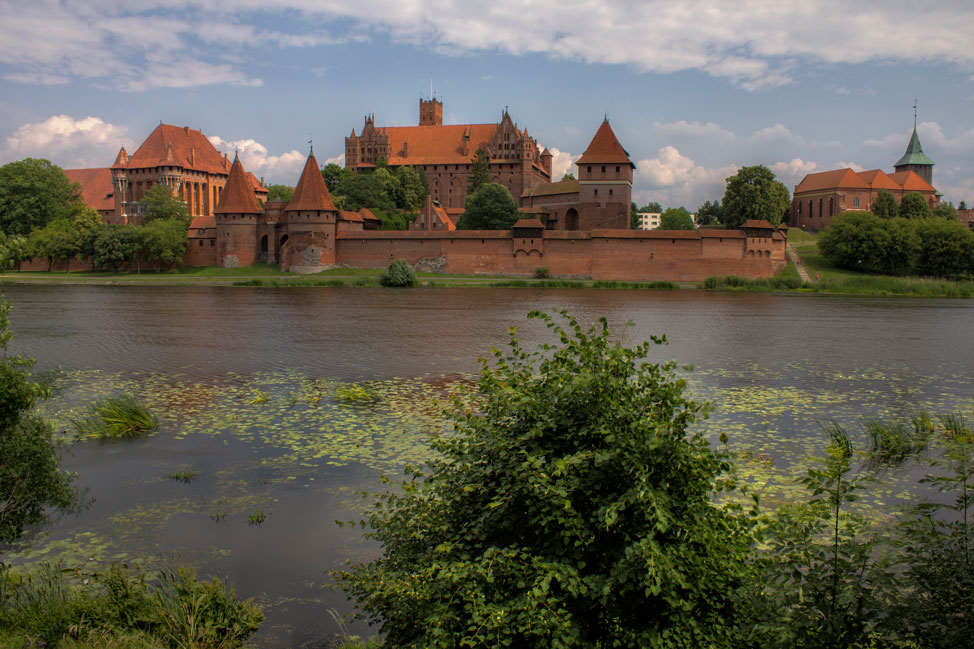 The Malbork Castle was built by the Teutonic Knights and completed in 1406 after the conquest of Old Prussia. It is a dominating presence on the banks of the Nogat River, having been expanded several times to accommodate the number of knights who resided there. It soon became the largest fortified Gothic building in Europe.