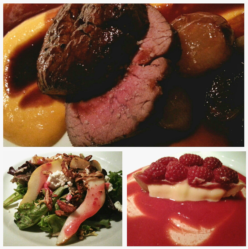 The first night: organic greens with pears and fresh goat cheese; beef tenderloin with caramelized pearl onions and carrot puree; raspberry tart for dessert.