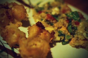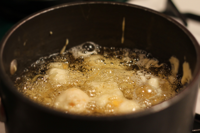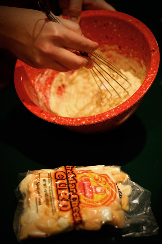 The batter was like any used for such battered things: onion rings, etc. Getting the curds completely covered and then into the hot oil was a bit of a messy undertaking, but I don’t suppose that the appearance of this dish is what is important.
