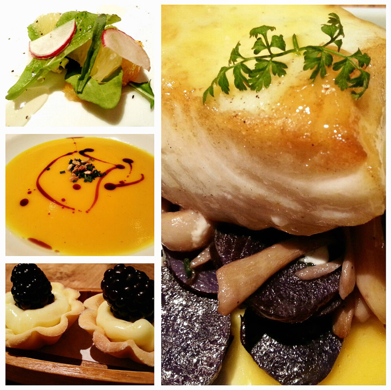 The second night: orange, arugula, radish and honey with cracked pepper; butternut squash soup with sunflower seeds, chives and sunflower oil; pan-seared Alaskan halibut with purple fingerling potatoes, mushrooms, and an orange rosemary sauce; blackberry tartlets for dessert.