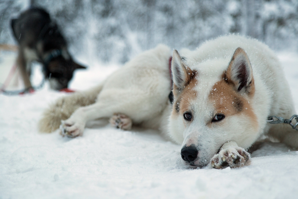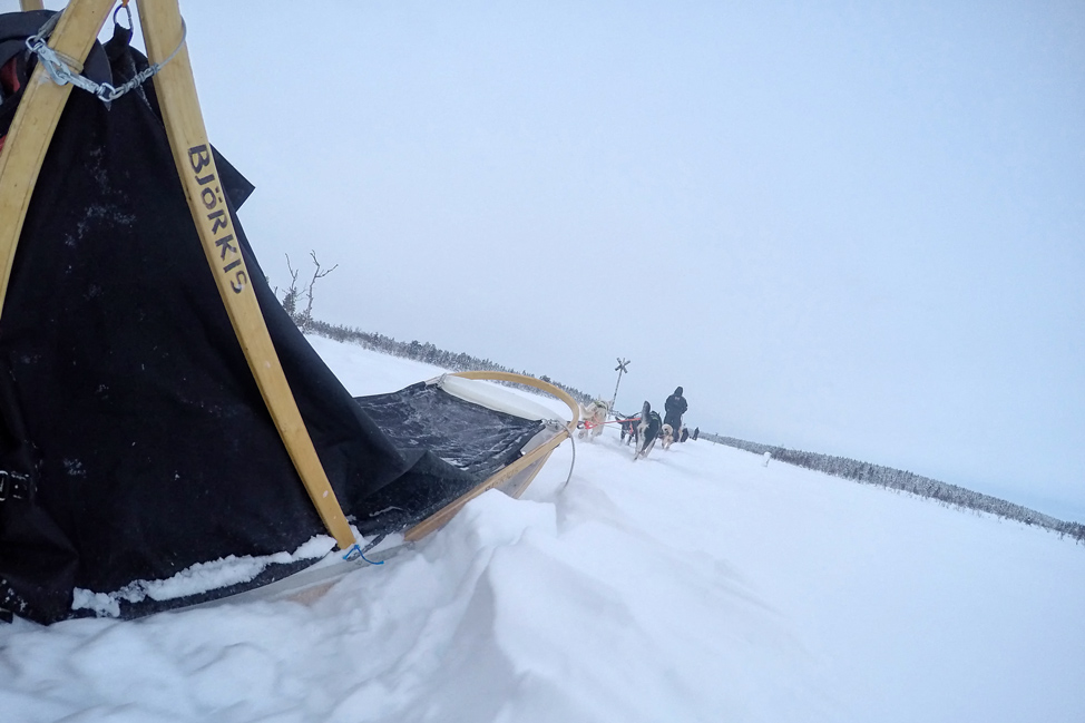 “We call those the Indiana Jones moments,” our guide said, as I relived several of my mishaps throughout our two days. Over the seventy plus kilometers we traveled, twice I fell off but managed to hold on, but there were many other instances I was close to losing it all. I once stepped off the sled to run with the dogs but sunk waist deep in the snow – I had to tip the sled on its side to get off the Teflon runners and force more of its surface area into the deep bank and stop the dogs from dragging me. Other times the dogs took corners so closely that the sled ended up almost at ninety degrees, it took a quick jump off and run alongside to avoid spilling entirely. But each time I followed the number one rule of dog sledding: to never let go. (Pete didn’t fair as well, having let the entire team go just an hour into our first day.) By the end of our long second day, we both ached. It was not quite the endurance activity that it was for the dogs, but it was intense nonetheless.