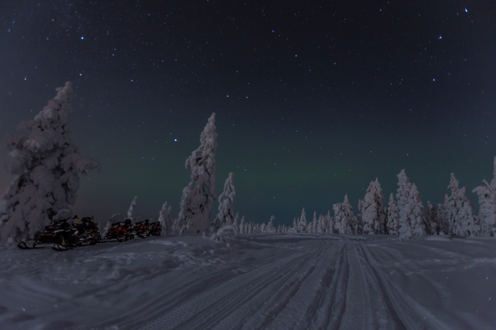 The irony was that I had tipped it just meters before the parking spot. Moments earlier I had been sitting inside a warm kota, sipping sweet hot fruit juice and roasting sausages, learning about the myths and realities of aurora borealis from our guide. Pete was outside, standing knee-high in a pile of snow, taking photo after photo, hoping to capture the elusive lights with his lens even though his eyes couldn’t see them. He burst back in to coax us out when the green had appeared. They were beginning, with no doubt, and our guide suggested that we pack up and head to higher ground.