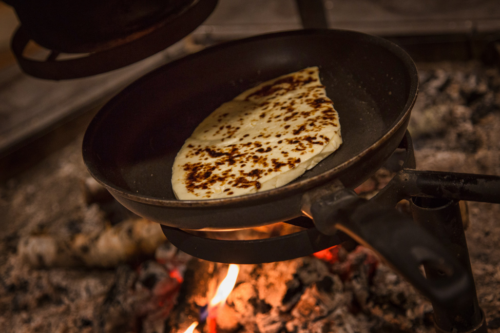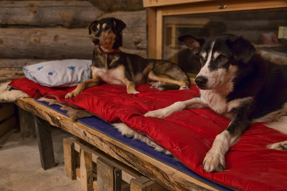 Our nourishment and rest at the end of the first day came in the form of hot reindeer stew and then fried cheese for dessert, all served in the glow of a grand kota recently built on the property. The warmth came not only from the central fire, reindeer pelts that we slept on and the sleeping bags provided, but the cuddle partners that were included as a part of the excursion. Four of them in total were let in to sleep with us, one nestled in on the other side of my pillow. Each time I raised my head to turn my body over, I could hear his tail thumping against the wall in anticipation of affection. Only once did he wake me as I slept though, nuzzling his wet nose against my forehead. A quick stroke of his fur settled him, and he left his nose on my pillow. (I did not mind one bit.)