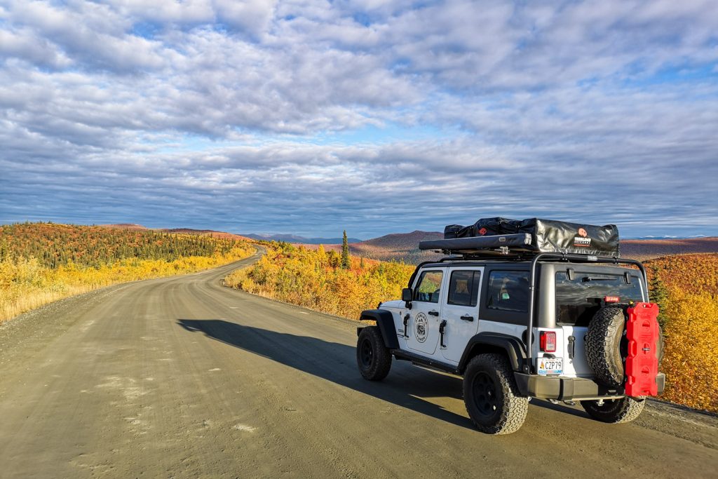 We completed the trip in a Jeep Wrangler from Overland Yukon. (And that’s what we woke up in while in Dawson City! It has an awesome tent on top of the roof.) We would not recommend doing this drive in a non-4X4 vehicle – if weather affects the roads at all along the route, it could get messy. Also, check into the tourism office in Dawson City for reports on road conditions before setting off.