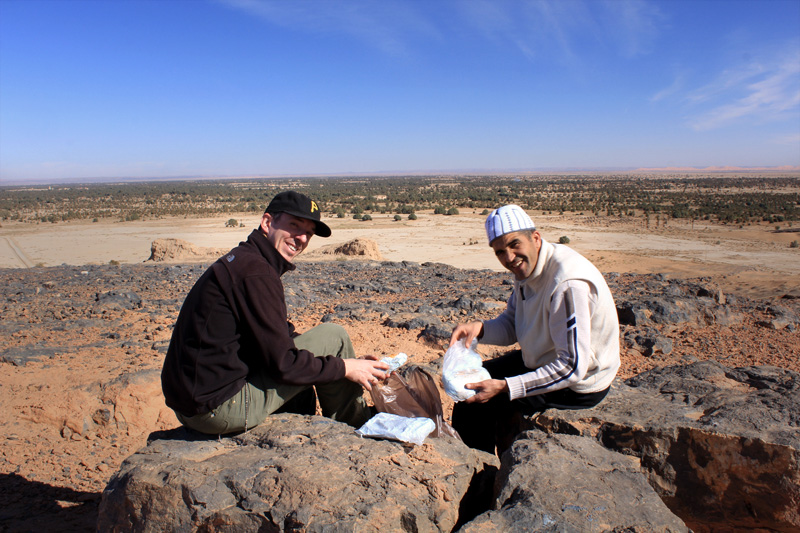 The bright orange sands of the Sahara could be seen in the distance, and beyond them the cliffs that struck the border between Morocco and Algeria. Towering mosque minarets were speckled throughout the countryside, surrounded by the small populations they were built for. Encased in the rock at our feet were innumerable fossils, some protruding from the stone. In the far distance were the snow-capped Atlas Mountains we had driven through the previous day.