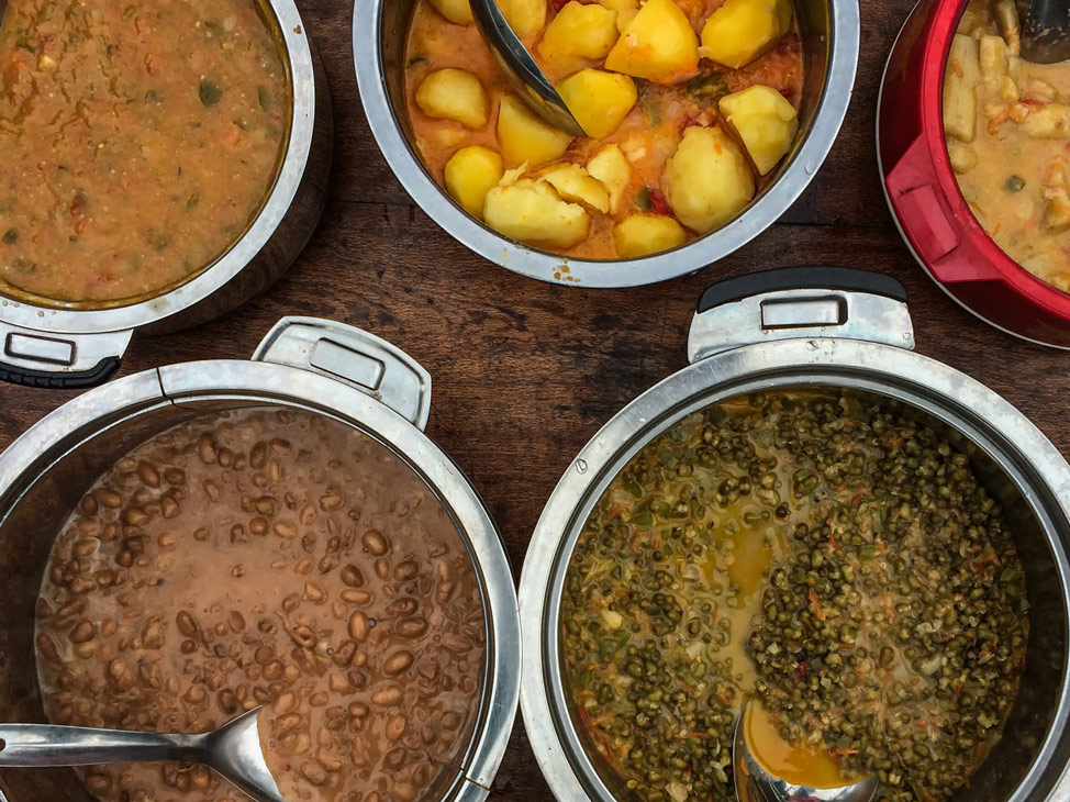 Stews, stews, and more stews. Beef stew, banana stew, served up over fresh rice and all of delicate flavours to sooth the more spicy salads which often occupy the same plate. It’s an abundance of carbs, a little bit of meat, and plenty of fresh vegetables.