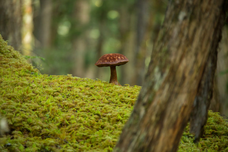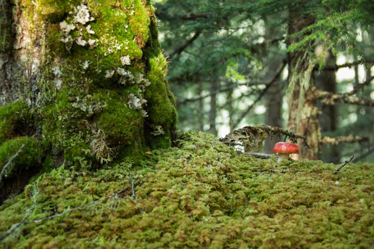 Both Pete and I looked at everything in a brand-new way. We eagerly pulled our canoes over to walk through mossy forests that likely saw very few footprints. We analyzed everything on a tiny level. “It’s amazing what can happen in a square inch,” Dave said. He and I were both crouched and inspecting the forest floor. We had taken a break to stretch our legs and climbed over tree limbs and rocks to find ourselves inspecting flowers, mosses, and mushrooms. “There’s a tree trying to grow through here,” he said, pointing to a tiny sprig, “There are three different types of moss and a small stone poking out. If this were on a grand scale, we would stand in awe of it,” Dave said. It made me think of grand natural wonders like the California Redwoods or New Brunswick’s Hopewell Rocks, with tourists flocking and pushing their way to the front for a photo. And there we were, peacefully huddled with wonders in front of our noses, inhaling the still and earthy aroma.
