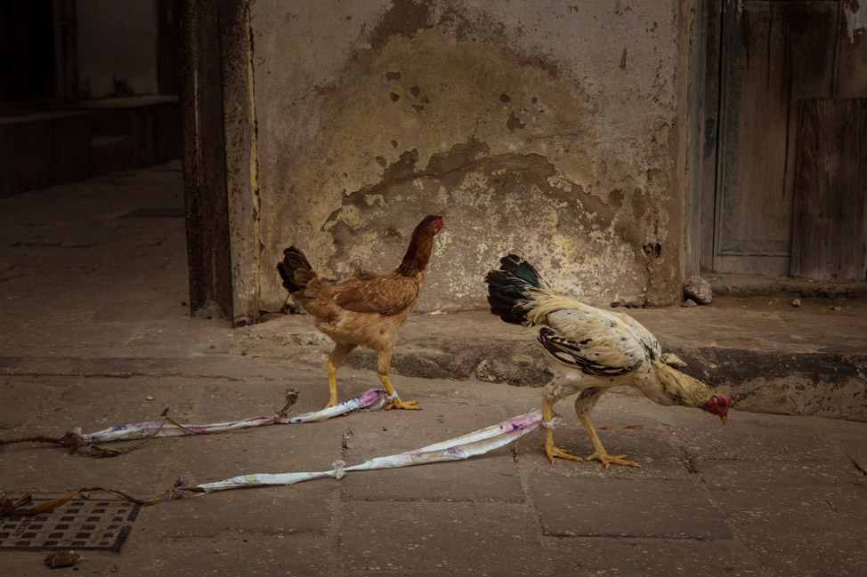 We came across a woman out for her morning walk with chickens being lead by homemade plastic leashes. I asked if I could capture the moment, but she wanted nothing to do with being in the frame. Instead she offered her fowl up as models. I gladly accepted her offer and caught her snickering in my peripheral view.