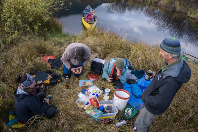 And we even found ourselves looking at poop with a whole new sense of wonder. Ever on the lookout for wildlife, we followed in Cheryl’s footsteps as she discerned the origins of all we found (moose, caribou, bear?) and approximately how long each pile had been left behind. The closest we got was to a grizzly who had clearly just feasted on berries nearby and dropped his scat on a beach about an hour before we rested there for lunch. None of us strayed far from the bear spray that noon hour as we devoured the meal Cheryl had prepared for our journey.